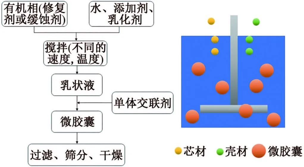 微膠囊對緩蝕劑/愈合劑的釋放可由機(jī)械損傷引起。當(dāng)涂層基體中出現(xiàn)小裂紋時(shí),裂紋擴(kuò)展的尖端應(yīng)力使微膠囊破裂,釋放愈合劑和緩蝕劑填充這些裂紋間隙,修復(fù)涂層裂縫。但如果微膠囊與涂層基體的兼容性差,則會(huì)削弱涂層基體和微膠囊之間的外部應(yīng)力傳遞,使微膠囊的破裂延遲。通過優(yōu)化制備工藝和對微膠囊表面進(jìn)行改性,改善了微膠囊與涂層基體之間的兼容性。微膠囊的外殼材料大多由聚氨酯(PUF)組成,但PUF毒性大,對生物體有害,而且PUF微膠囊外殼在長期運(yùn)輸和儲(chǔ)存過程中容易發(fā)生坍塌等結(jié)構(gòu)變形。因此,更穩(wěn)定、更環(huán)保的聚苯乙烯(PS)、聚砜(PSF)、環(huán)糊精基超分子材料、海藻酸鈣等逐漸成為微膠囊外殼材料替代品。微膠囊通常通過原位乳液聚合法制備,原位乳液聚合法不僅操作簡單,而且可以控制殼的厚度和膠囊的大小,具體步驟如圖1所示。