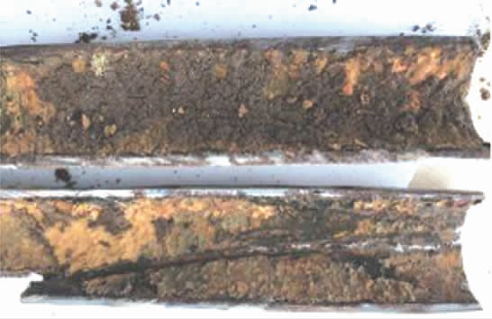 割取一段泄漏管樣,其上多個泄漏點位于一條直線上。對剖管樣,發(fā)現(xiàn)內(nèi)壁積累了厚厚的沉積物,局部沉積物出現(xiàn)分層,表層與底層的外觀有明顯差異,如圖5所示。