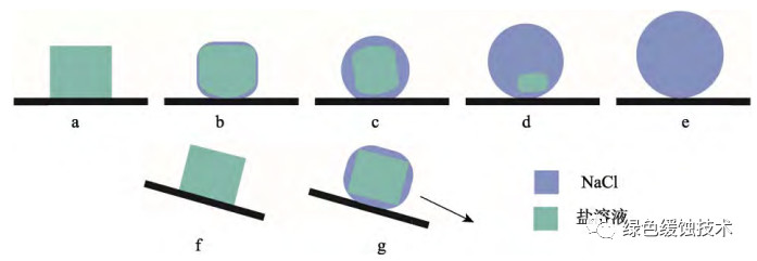 今年是我國海軍建設(shè)70周年,我國海軍順利實現(xiàn)了從“蔚藍(lán)”走向“深藍(lán)”的偉大轉(zhuǎn)變。但是在海洋環(huán)境下金屬很容易發(fā)生氧化腐蝕,對由金屬材料制造的各種軍事裝備構(gòu)成了巨大威脅。超疏水表面具有防腐蝕功能,在水面艦艇、潛艇、魚雷等海軍裝備表面處理方面存在巨大應(yīng)用價值。在海洋腐蝕防護(hù)中,一方面,超疏水表面膜層中的空氣可有效抑制金屬基底與腐蝕介質(zhì)的直接接觸,從而降低腐蝕速率,起到腐蝕防護(hù)的作用;另一方面,在海洋大氣環(huán)境中,超疏水表面以其特有的“自清潔”效應(yīng),使附著在金屬表面的鹽粒潮解滑移。如下圖所示,鹽粒在超疏水表面的潮解過程中會在表面張力的作用下逐漸向上抬升。在液體潤滑和表面低粘附力的共同作用下,潮解的鹽粒可在傾斜的超疏水表面發(fā)生滑移,進(jìn)而避免了因潮解形成的強(qiáng)電解質(zhì)溶液對基體的腐蝕。