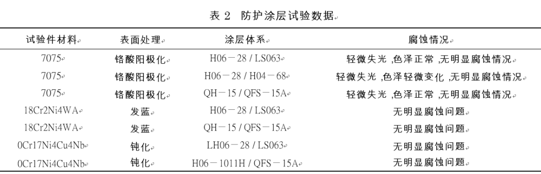 防腐蝕設計的重要一環(huán)就是要選擇防護涂層體系,尤其對那些在腐蝕環(huán)境惡劣條件下工作的重要零 部件和對腐蝕敏感的材料,更要嚴加把握,機載設備中采用較多的防護涂層為環(huán)氧聚酰胺涂層體系(H06-28 底漆、H04-68 面漆) ,針對水上使用環(huán)境要求高的產(chǎn)品,可使用聚氨酯涂層體系( LS063 / LS083) ,該涂層體系具有很好的耐高低溫性,耐濕熱性,耐鹽霧性,耐人工加速老化性,耐有機溶劑和化學藥品性等。但是,海洋對涂層體系的考核是更加嚴酷的,采用耐濕熱抗鹽霧表面涂料,如目前最新研制了鋁合金用QH-15 防腐環(huán)氧底漆、鋼用 H06-1011H 防腐環(huán)氧底漆與面漆 QFS-15A 耐候聚氨酯磁漆配套的新型防護涂層體系[5],試驗結(jié)果見表 2 所列。
