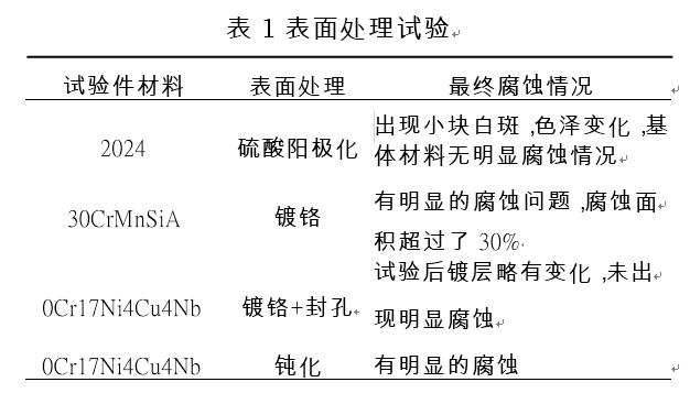 從表 1 可知,2024 表面進行硫酸陽極化處理,在第 10 天結(jié)束出現(xiàn)局部腐蝕問題,出現(xiàn)小塊白斑,色澤變化,基體材料無明顯腐蝕情況,由于鋁的陽極化一般利用酸性溶液溶解工件表面的氧化物,并形成氧化膜,但膜層為多孔特點,對于較復雜的結(jié)構(gòu)組件零件,經(jīng)酸洗后容易浸入縫隙,引起基體金屬腐蝕;30CrMnSiA 鍍鉻后,初始有輕微紅銹,第 4 天結(jié)束出現(xiàn)較 嚴 重 腐 蝕 問 題,腐 蝕 面 積 超 過 了 30%,0Cr17Ni4Cu4Nb 鍍鉻和封孔處理后無明顯的腐蝕現(xiàn)象,鉻金屬在空氣中極易形成鈍化膜,鍍鉻層微型裂紋且多孔,因此單層鉻層不易做防護層,但進行孔隙封閉處理后,阻止孔內(nèi)電化學反應,提高耐蝕性;0Cr17Ni4Cu4Nb 鈍化處理后,有明顯的腐蝕現(xiàn)象,通過試驗及相關文獻,在海洋環(huán)境試驗下,多數(shù)僅采用鈍化處理的不銹鋼試驗件在短期內(nèi)出現(xiàn)程度不同的銹蝕現(xiàn)象,還需進一步采取腐蝕防護措施。