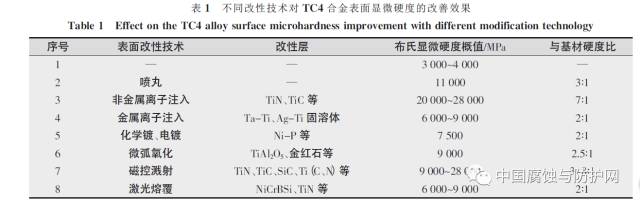 目前,提高鈦合金耐磨性的表面改性技術(shù)很多,應(yīng)用較為廣泛的有噴砂或噴丸、化學(xué)鍍、離子注入、磁控濺射、微弧氧化、激光表面處理等。不同的改性技術(shù)對鈦合金表面硬度的改善效果見表1。