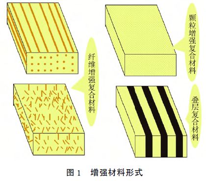 復(fù)合材料是由兩種或兩種以上物理和化學(xué)性質(zhì)不同的物質(zhì)組合而成的一種多相固體材料。雖然復(fù)合材料各組分材料仍保持其相對(duì)獨(dú)立性,但復(fù)合材料的性能卻并非組分材料性能的簡(jiǎn)單加和,而是表現(xiàn)出遠(yuǎn)優(yōu)于兩者的性能。通常在復(fù)合材料中有一相為連續(xù)相,稱為基體,用以粘結(jié)、固定、維持增強(qiáng)材料成一定形狀;另一相為分散相,稱為增強(qiáng)相或增強(qiáng)體,增強(qiáng)材料在復(fù)合材料中不構(gòu)成連續(xù)相,它在基體支持下提供強(qiáng)度和剛度。分散相是以獨(dú)立的形態(tài)分布在整個(gè)連續(xù)相中的,可以是增強(qiáng)纖維,也可以是顆粒狀彌散的物料。不同增強(qiáng)材料的形態(tài)如圖1 所示。