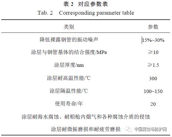 普通的金屬合金材料涂覆在艦船表面容易因摩擦、電位腐蝕、海水腐蝕等情況導致涂層脫落,從而失去涂層的作用,而金屬陶瓷涂層除了具有金屬的韌性同時也具有陶瓷本身的化學惰性能夠有效阻隔海水、電位帶來的腐蝕。金屬陶瓷復合涂層技術經(jīng)歷了2 個階段:首先是兩層涂層階段,兩層涂層由表面陶瓷涂層和內部金屬涂層組成,外層陶瓷涂層起表面隔離的目的,內部金屬涂層起保護作用,涂層能夠有效阻隔海水或者微生物帶來的侵襲,但兩層涂層也有其固有缺陷,如陶瓷涂層和金屬涂層直接接觸會帶來的膨脹系數(shù)不均勻甚至因此導致涂層碎裂的問題、也會因導熱系數(shù)不同而導致溫度傳導問題。為克服此類問題,研究者們使用了中間層這一過度體來連接金屬和陶瓷涂層,保證傳熱和膨脹的順暢性,克服了涂層直接接觸的固有問題,緩解了熱傳導問題及膨脹剝落問題。影響金屬陶瓷涂層的因素有很多,其中最重要的是金屬陶瓷涂層材料的選取以及噴涂技術的選取,同時這些決定因素也是金屬陶瓷涂層能夠得到廣泛應用的關鍵。影響金屬陶瓷涂層耐腐蝕的因素主要有:材料中摻雜元素的選取比例、粘結層的厚度等,例如就粘結厚度來說,能夠顯著影響艦船材料的耐腐蝕性能,鈷鎳鋁合金在最優(yōu)厚度下,能夠緩解應力集中而導致的涂層破裂問題,粘結層厚度的選擇能夠決定對內層-艦船材料和對外層-接觸層的元素供給量(一般為鋁元素,粘結層對外提供高鋁,高鋁具有非常好的耐腐蝕的性能)。隨著研究進一步加深,人們逐步推導出了最優(yōu)過渡層厚度,該過渡層既能緩解因應力過度集中而導致的涂層剝落,又能實現(xiàn)對內對外元素供給,起到耐腐蝕的作用。摻雜元素的選擇在于艦船材料的實際需求,根據(jù)實際需求對金屬陶瓷涂層進行成分調節(jié),可以實現(xiàn)艦船材料的多種功能。值得一提的是,研究證明具有優(yōu)良性能的金屬陶瓷涂層并不是簡單的兩層涂覆,而是充分考慮了應力、成分、隔熱性能、耐腐蝕性等多種因素的機械性能復合,這也是與以往研究重大不同的地方。關于金屬陶瓷涂層的應用在國內進行了廣泛的研究,開發(fā)出了具有減震降噪耐腐蝕性能的金屬陶瓷涂層,該涂層采用多層復合結構,在結構和系統(tǒng)上對噪音實現(xiàn)衰減,具有優(yōu)良的耐高溫、耐海水腐蝕、耐船艙內煙氣和各種腐蝕介質腐蝕的性能。表2 為對應參數(shù)表。