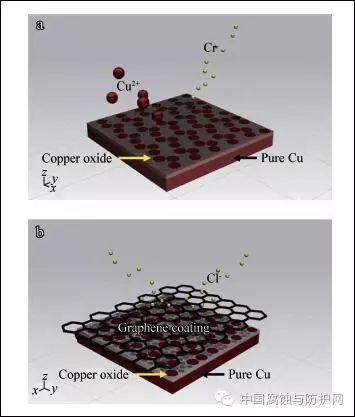 不同基體的腐蝕機(jī)制原理圖:(a)銅基體;(b)銅-石墨烯基體