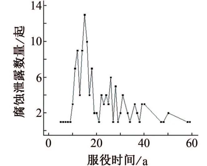 圖1 管道發(fā)生腐蝕泄漏事件數(shù)量隨管道服役時(shí)間的變化關(guān)系