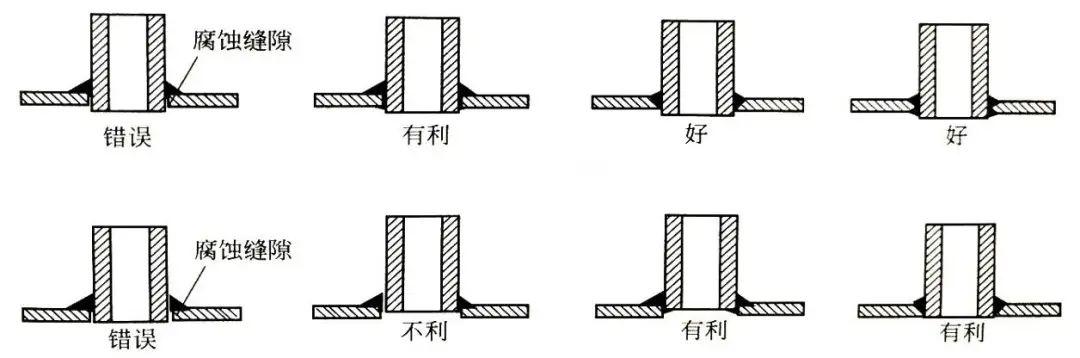 當(dāng)金屬材料與含氧量不同的同一介質(zhì)接觸時(shí),將在陽極側(cè)(低氧濃度側(cè))形成腐蝕,這是一種普遍存在的、危害性極大的腐蝕破壞形式。縫隙腐蝕發(fā)生的主要原因是因?yàn)檠鯕庠诳p隙中難以擴(kuò)散,導(dǎo)致氧濃差所致。埋地管線亦因其土壤密度及深度不同引發(fā)氧氣含量不同,防止氧濃差腐蝕的結(jié)構(gòu)實(shí)例見下圖。