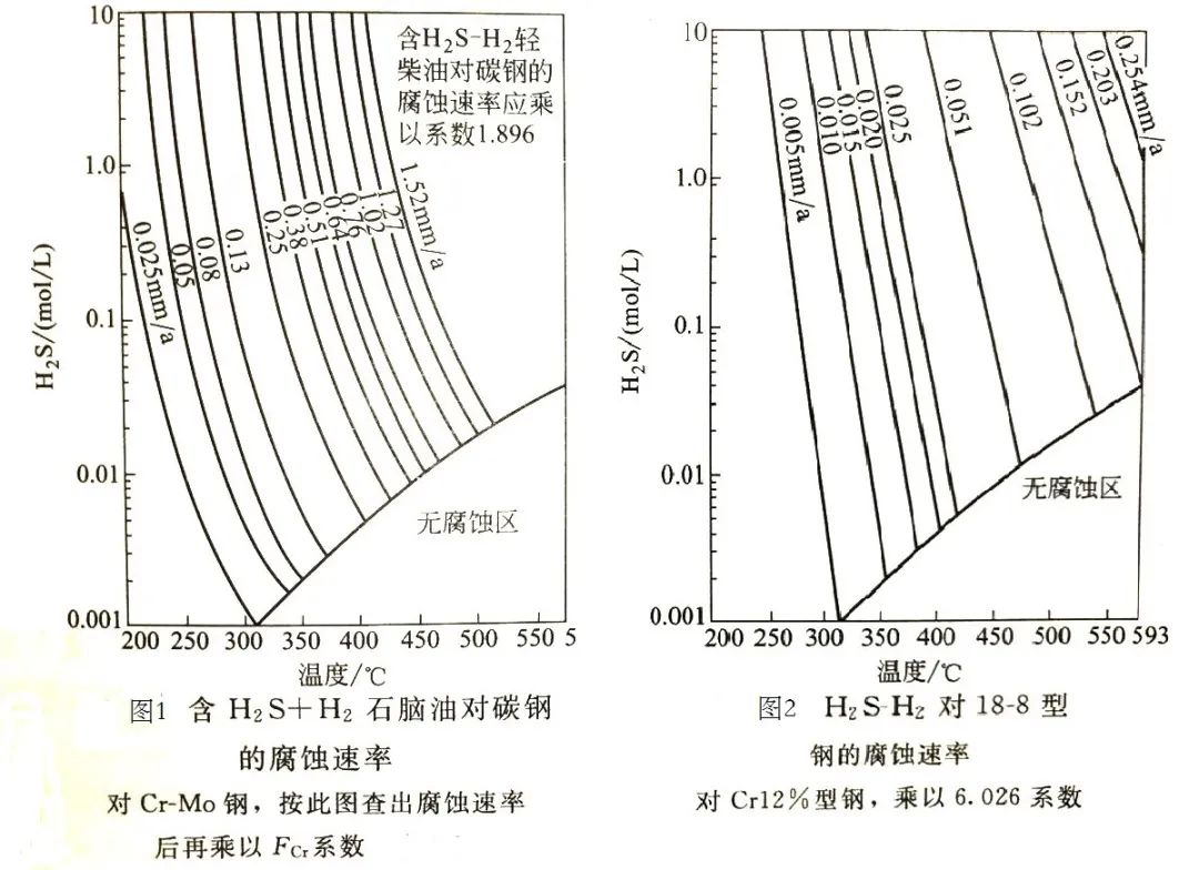 各種鋼材的H2-H2S的腐蝕速率可按庫柏·高曼(Couper Gtorman)曲線查出。圖1是以石腦油為稀釋劑的H2S-H2對碳鋼的腐蝕速率。若以柴油為稀釋劑,H2S-H2對碳鋼的腐蝕速率則應(yīng)乘以1.896倍(腐蝕加重)。若采用Cr-Mo鋼,其腐蝕速率將隨著含Cr量的增加而降低,則需乘以Fcr系數(shù)(表1)。圖2為H2S-H2對18-8型不銹鋼的腐蝕速率,當用Cr12%型鋼,則乘以6.026系數(shù)。