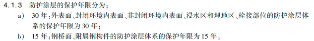 即,對(duì)于主要結(jié)構(gòu),要求30年的保護(hù)年限,對(duì)于鋼橋面和附屬鋼結(jié)構(gòu),要求15年的保護(hù)年限。