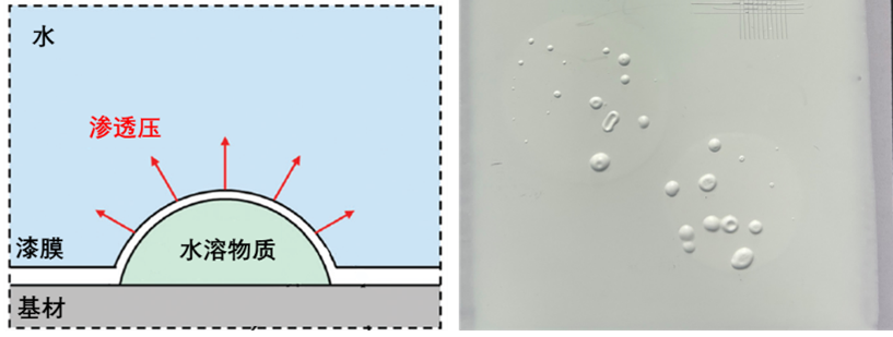 在與水的接觸下,漆膜聚合物或多或少都會(huì)有水汽滲入,這樣漆膜與基材接觸界面的缺陷處會(huì)形成“水洼”,在溶解了一些水溶性物質(zhì)后產(chǎn)生滲透壓,與附著力以及漆膜聚合物的模量之間抗衡,若滲透壓過(guò)大則起泡直至剝離。因此,減少涂料配方中的水溶性物質(zhì)有利于降低滲透壓的影響。