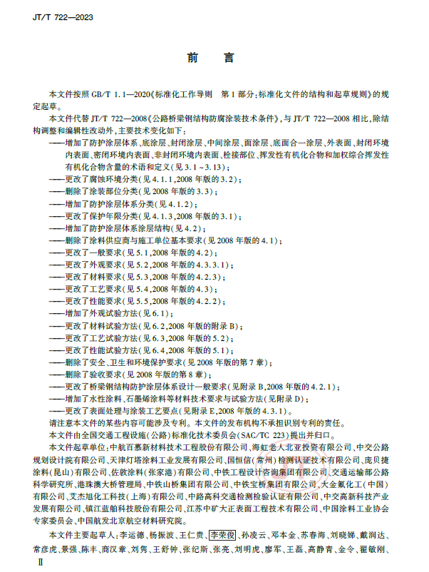 交通運輸部于2023年6月25日批準發(fā)布了推薦性行業(yè)標準《公路橋梁鋼結(jié)構(gòu)防腐涂裝技術條件》(JT/T 722—2023),自2023年9月25日起實施。