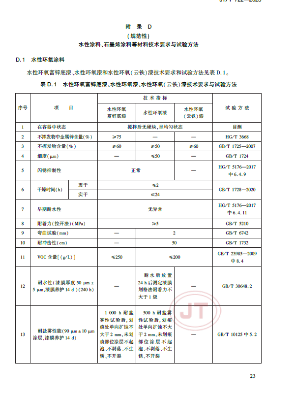 (九)附錄 D,增加了水性涂料、石墨烯涂料等材料技術要求與試驗方法。增加了規(guī)范性附錄D,對水性涂料、石墨烯涂料等新型材料的技術要求與試驗方法做了詳細、具體的規(guī)定,有助于提升新產(chǎn)品在工程實踐中的可靠性。