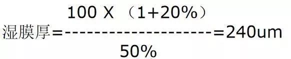 例:固體含量為50%的油漆,稀釋20%后,要施工厚度為100um的干膜。為確保 達(dá)到所指定的干膜厚度,油漆所施工的濕膜厚度應(yīng)為多少呢?
