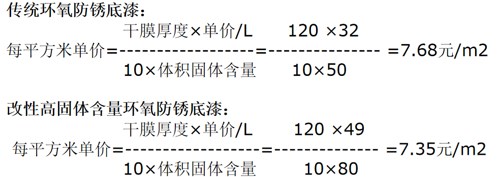 例:一塊結(jié)構(gòu)物,要求施工干膜厚度為120微米的環(huán)氧底漆,傳統(tǒng)的環(huán)氧底漆固體含量為50%,假如單價為32元/L,高固體含量改性環(huán)氧底漆固體含量為80%,假如單價為49元/L,從中可以看出,使用高固體含量的改性環(huán)氧底漆,每平方米單價要低。
