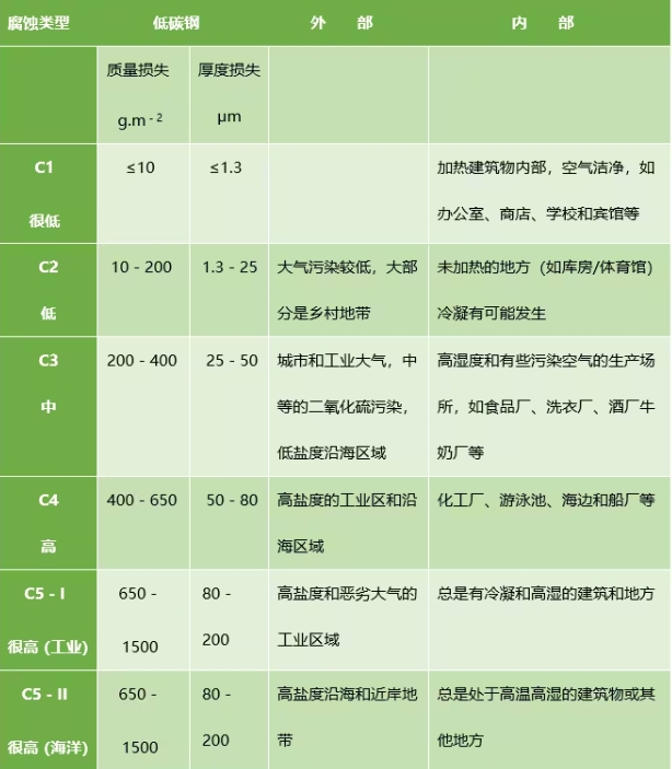 按照國際標(biāo)準(zhǔn)化組織的腐蝕分類體系, ISO12944標(biāo)準(zhǔn)將腐蝕類型分為以下幾類。