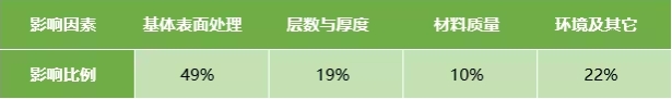 有機(jī)涂料覆蓋層防腐蝕壽命的決定因素有材料質(zhì)量、涂層厚度、施工質(zhì)量和使用環(huán)境等,一般影響涂層使用壽命的因素比例如下: