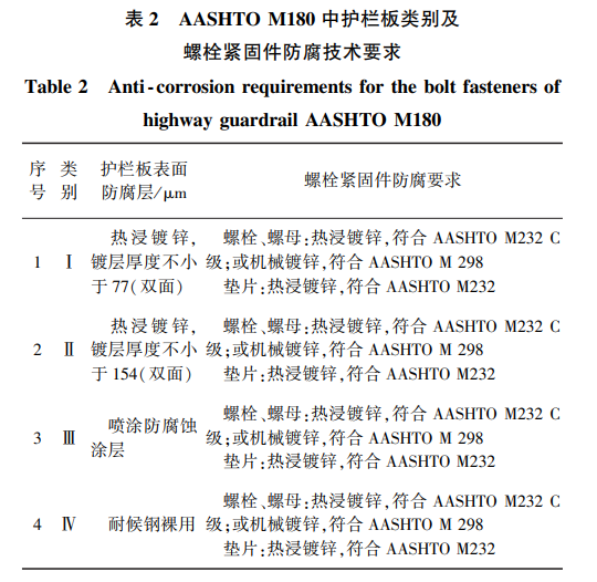 國外發(fā)達國家對高速公路護欄的研究和應用起步 較早,美國、英國在 20 世紀 60 年代就開展了公路護欄 的碰撞試驗研究工作,建立了完善的高速公路護欄試 驗、評價標準和高速公路護欄板產(chǎn)品標準[8] 。美國高 速公路護欄標準 AASHTO M180“高速公路護欄板技術 規(guī)范”對護欄安裝緊固用的螺栓、螺母、墊片的表面防 腐給出齊全的技術要求,標準將護欄板按表面防護層 類別分為 4 類(見表 2),其中配套用的螺栓緊固件也根 據(jù)護欄板的類別給出了具體的防腐要求,4 類護欄板配 套用的螺栓、螺母、墊片表面防護建議采用熱浸鍍鋅層 或機械鍍鋅層。 另外,國外護欄板技術標準對螺栓緊固件表面鍍 鋅層(熱浸鍍鋅和機械鍍鋅層)的厚度、結合強度、平整 度等外觀質(zhì)量也給出了規(guī)范要求。同時發(fā)現(xiàn),螺紋標準件的 其 它 國 外 標 準 文 獻 如 ASTM A307 “ 抗 拉 強 度 370MPa 碳鋼螺栓、螺柱、螺桿技術規(guī)范”、ASTM A354 “調(diào)質(zhì)合金鋼螺栓、螺柱及其它外螺紋緊固件技術規(guī) 范”、ASTM A449“最小抗拉強度 120 / 105 / 90 ksi 熱處 理鋼六角頭螺釘、螺栓、螺柱技術規(guī)范”、ASTM A325 “抗拉強度 725 ~ 830 MPa 熱處理鋼螺栓技術規(guī)范”、 ASTM A563“碳鋼和合金鋼螺母技術規(guī)范”中當有鍍鋅 要求時,則規(guī)定采用熱浸鍍鋅和機械鍍鋅,且對 2 類鍍 鋅層的厚度都做了量化要求??梢?,國外護欄螺栓緊 固件防腐的技術標準化已經(jīng)相當完善,主要技術指標 已經(jīng)量化,技術標準具有較強的實踐性,這非常值得我 們學習。