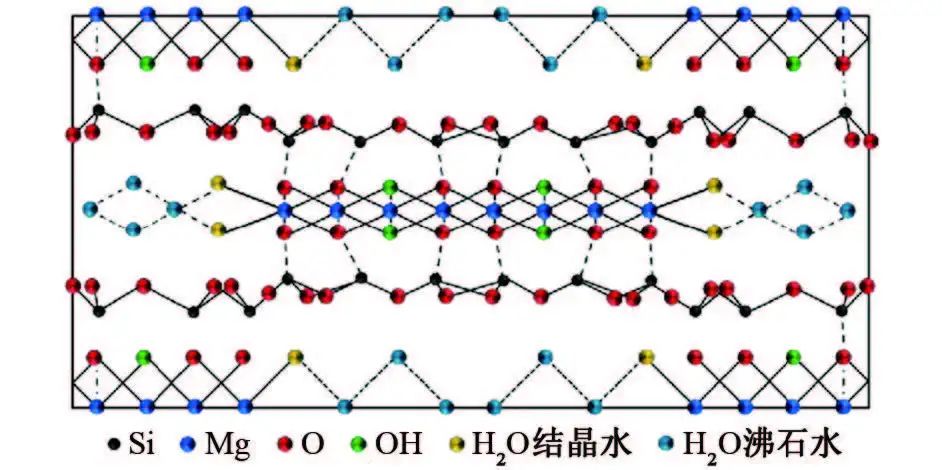 海泡石是一種無毒、無害的含水富鎂硅酸鹽黏土礦物,理想分子式為Si12Mg8O30(OH)4(OH2)·8H2O,在顯微鏡下呈纖維狀,其纖維長度為0.2~5 μm,寬度為100~300 nm,厚度為50~100 nm。海泡石由兩層硅氧四面體夾一層鎂氧八面體結(jié)構(gòu)交替排列組成,具有鏈狀和層狀的過渡型結(jié)構(gòu)特征,其結(jié)構(gòu)中存在3種形式的水:第一種為吸附于礦物表面并進(jìn)入結(jié)構(gòu)孔道的沸石水(H2O),也稱為吸附水;第二種為空間壁面上受Mg2+束縛的結(jié)晶水(OH2),也稱配位水;第三種是結(jié)構(gòu)中的結(jié)構(gòu)水(OH),也稱羥基水,位于硅氧八面體中心,如圖1所示。這種結(jié)構(gòu)使得海泡石具有化學(xué)穩(wěn)定性好、比表面積大、吸附性和催化性好等特點(diǎn)。此外,海泡石也有著較強(qiáng)的耐酸堿腐蝕性能,當(dāng)pH小于3或大于10時,其晶體結(jié)構(gòu)才會被完全破壞。