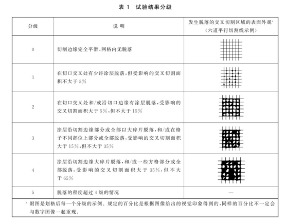 劃格法附著力測(cè)試標(biāo)準(zhǔn)主要有GB/T 9286-2021/IDT,ISO 2409、ASTM D 3359。其測(cè)試方法和描述基本相同,只是對(duì)于附著力級(jí)別的說明次序剛好相反。ASTM D 3359是5B-OB級(jí)由好到壞,而ISO 2409是0-5為由好到壞。