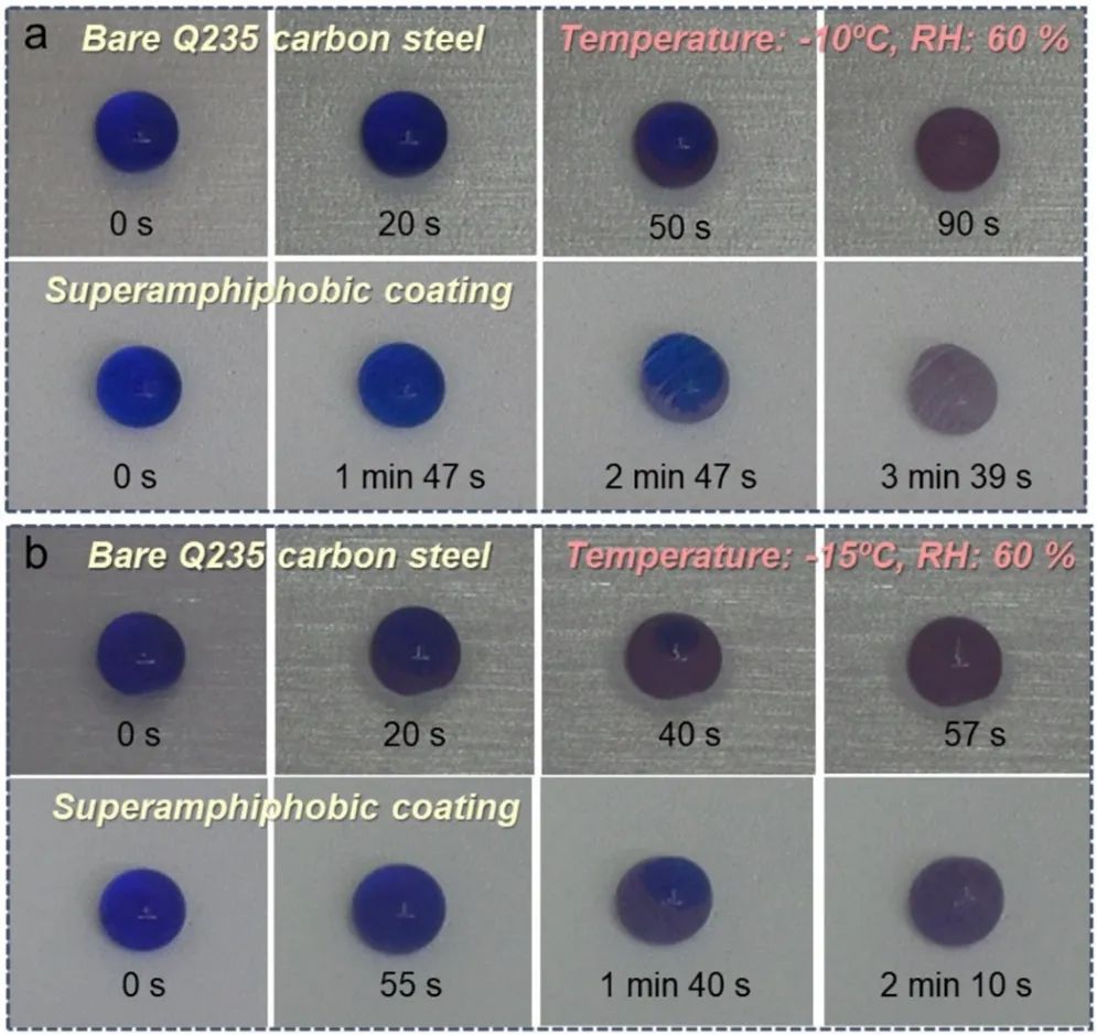 -10℃和-15℃低溫環(huán)境下的結(jié)冰測試也進(jìn)一步揭示了涂層具有顯著的延遲結(jié)冰和降低界面冰粘附力特性。