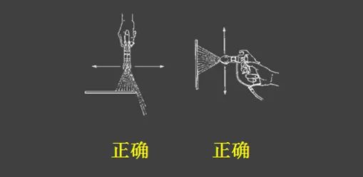 1. 正確的持槍操作方法,操作噴槍時(shí)首先要做到的是應(yīng)使噴槍與被噴涂工件方向保持垂直,而噴槍在移動過程中其軌跡要與噴涂表面保持平行,即保持與被涂面相同距離情況下,以穩(wěn)定一致的速度平行移動或通過噴涂面。