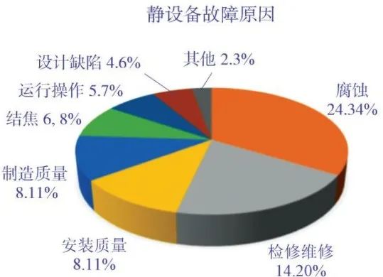 中石化曾做過統(tǒng)計(jì),靜設(shè)備故障主要是腐蝕穿孔或焊縫開裂、砂眼等。靜設(shè)備故障中,腐蝕原因占比近1/3,其次是檢維修、安裝質(zhì)量、制造質(zhì)量,靜設(shè)備故障原因如圖1所示。