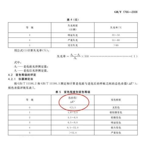 (3)色差方面沒有明確的界定,一般的油漆色差值是控制在0.3-0.5%(一般色卡的生產(chǎn)商的色差值也就控制在0.5%)。GB/T 1766-2008《色漆和清漆 涂層老化的評級方法》對于無變色的色差要求是≤1.5。