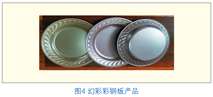 我們對(duì)金屬顏料進(jìn)行了無(wú)機(jī)物和有機(jī)物多層包覆表面處理,有目的地改善了金屬顏料的導(dǎo)電性和與粉末的相容性,再經(jīng)過(guò)一種特殊的邦定生產(chǎn)工藝,得到了邦定率非常高的金屬粉末涂料產(chǎn)品,可以做到10%以上甚至20%鋁粉和珠光粉含量的產(chǎn)品并具有很好的使用性能。我們稱(chēng)之為全邦定金屬粉末涂料。用全邦定金屬粉末涂料技術(shù)制備的彩鋼板金屬粉末涂料,可以穩(wěn)定地生產(chǎn)各種金屬彩鋼板,包括幻彩彩鋼板產(chǎn)品(圖4)。