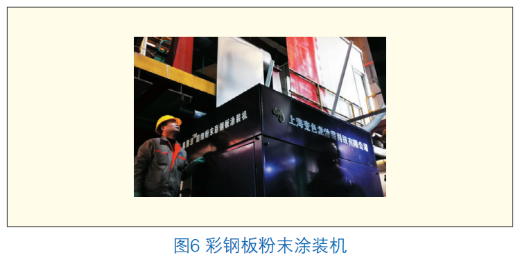 彩鋼板涂裝是一個(gè)很大的行業(yè),液體彩鋼板涂料經(jīng)過(guò)幾十年的開(kāi)發(fā),已經(jīng)有很多種成熟穩(wěn)定的涂料品種,早已經(jīng)是一個(gè)很成熟的行業(yè)。粉末涂裝因?yàn)闃?shù)脂相對(duì)分子質(zhì)量大,相對(duì)液體涂裝,涂層性能有明顯優(yōu)勢(shì)。彩鋼板粉末涂裝(圖5)雖然有著巨大的發(fā)展前景,但目前基本上處于待開(kāi)發(fā)的狀態(tài),在原材料技術(shù)、粉末涂料配方技術(shù)等各方面都急迫需要加大力度開(kāi)發(fā),盡快形成一個(gè)新品類(lèi)的行業(yè)。