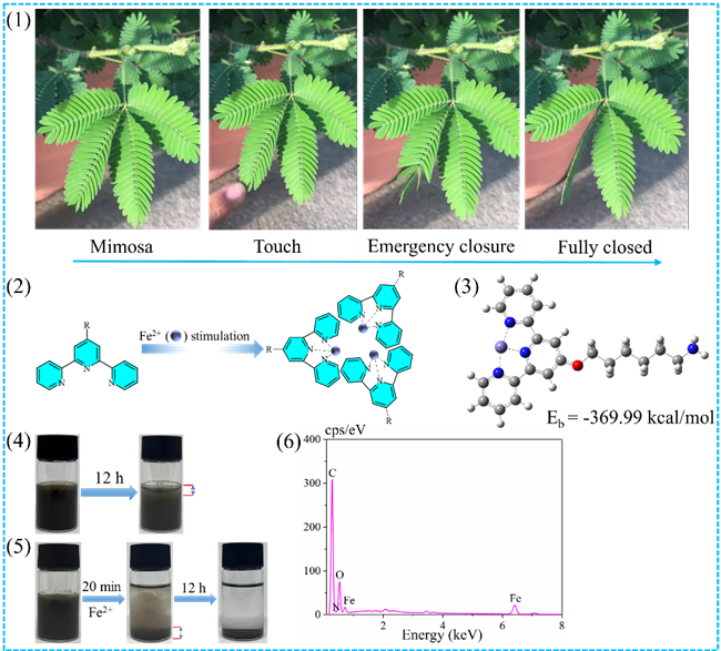 圖3. 觸摸含羞草的應(yīng)激過程(1);在亞鐵離子刺激下吡啶結(jié)構(gòu)的閉合機制(2)和理論計算模型(3);ATGO在去離子水中的分散現(xiàn)象(4);向ATGO分散液中加入亞鐵離子后的現(xiàn)象(5);ATGO和亞鐵離子絡(luò)合物的元素分析(6)