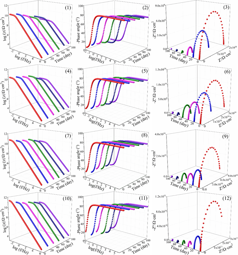 圖4. CM(1-3)、GO-CM(4-6)、TGO-CM(7-9)和ATGO-CM(10-12)在3.5wt%鹽水中浸泡100天期間的Bode、相角和Nyquist圖