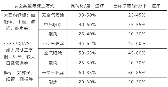 通過防腐蝕涂料損耗原因分析,就可以有針對性的采取有效的控制損耗的方法。雖然涂裝過程中造成涂料浪費的原因各種各樣;但是止損的方法也是有規(guī)律可尋,并且最大限度的降低損耗帶來的經(jīng)濟損失。根據(jù)規(guī)律和長期的防腐蝕涂裝經(jīng)驗,防腐蝕施工技術(shù)人員歸納了一些涂料損耗系數(shù),在保證涂層質(zhì)量的基礎(chǔ)上盡量不可以超出此范圍,否則會直接導(dǎo)致施工利潤降低或者虧本的后果,經(jīng)驗損耗系數(shù)如下(供參考):