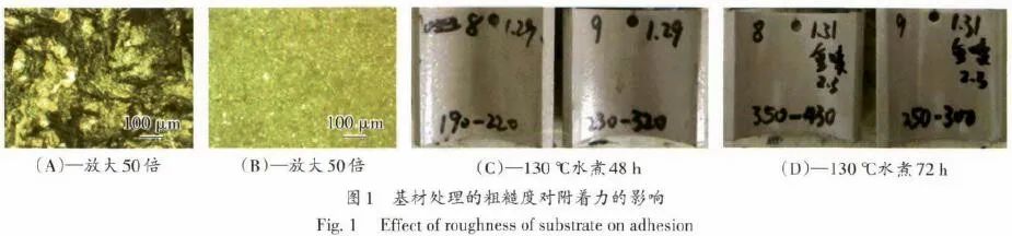 圖1(C)和圖1(D)的結(jié)果顯示,粗糙度低的基材的涂層水煮48h出現(xiàn)了明顯的水泡現(xiàn)象,而粗糙度高的水煮72h仍然沒有變化。