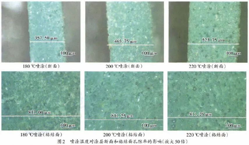 選用同一種粉末涂料,分別在180℃、200℃和220℃3個溫度下進行噴涂,然后在200℃下固化。在顯微鏡下觀察涂層斷面和粘結(jié)面的孔隙率情況,結(jié)果如圖2所示。
