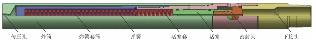 目前使用比較成熟的井下放氣閥在結(jié)構(gòu)上大體類似,都是通過壓力驅(qū)動活塞克服彈簧預(yù)緊力,實現(xiàn)軸向往復(fù)運動,從而實現(xiàn)閥體的開啟和關(guān)閉,其結(jié)構(gòu)如圖2所示。