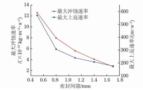 圖5 密封間隙對最大沖蝕速率和最大上返速率的影響