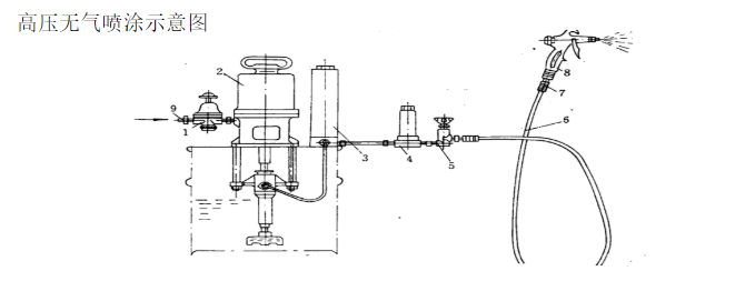 1-調(diào)節(jié)閥2-高壓泵3-蓄風(fēng)器;?4-過(guò)濾器;?5-截止閥門;6-高壓軟管;?7-旋轉(zhuǎn)接頭;?8-噴槍;?9-壓縮空氣入口。